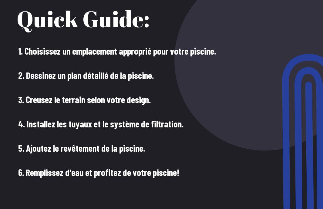 A: Pour construire une piscine creusée, vous devez suivre plusieurs étapes clés : d’abord, choisissez l’emplacement idéal pour votre piscine, puis créez un plan détaillé qui inclut les dimensions et le style de la piscine. Ensuite, obtenez les permis nécessaires auprès de votre municipalité. Une fois que tout est en ordre, creusez l’emplacement, installez la structure (béton, panneaux ou liner), mettez en place la plomberie et l’électricité, et enfin, ajoutez les finitions comme le carrelage ou le liner et remplissez la piscine d’eau.