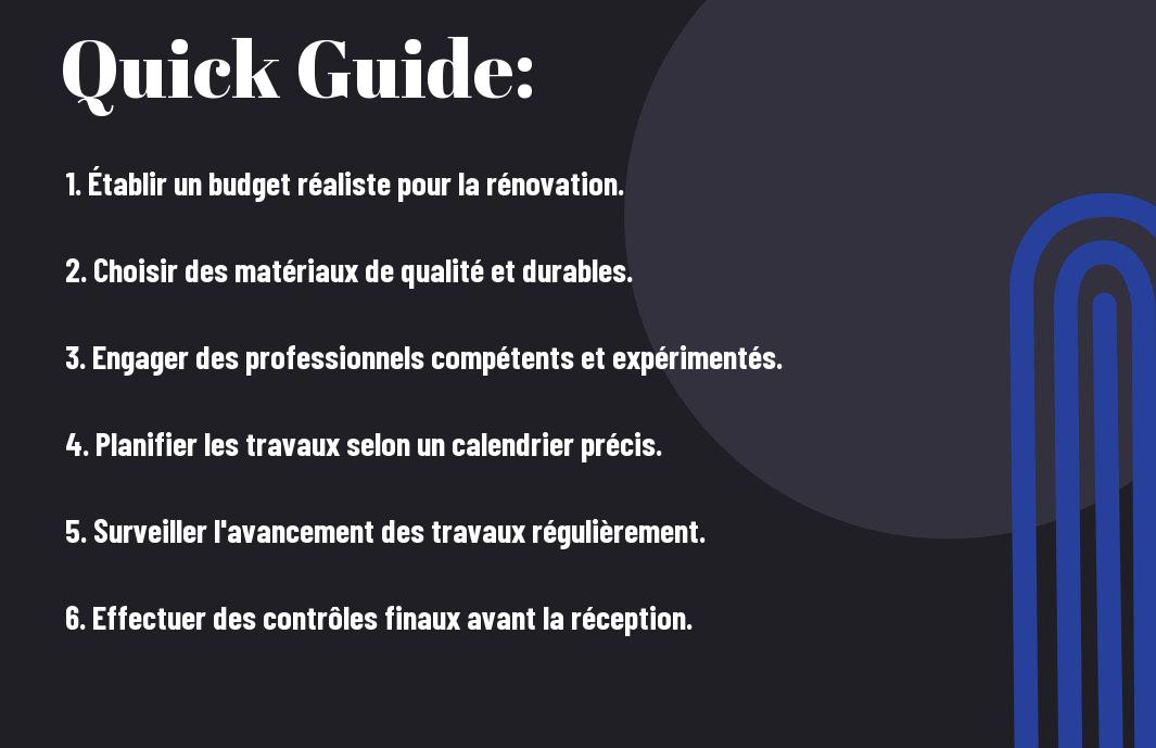 A: La rénovation d’une piscine complexe nécessite de suivre plusieurs étapes clés. Tout d’abord, il est essentiel d’établir un projet clair en définissant vos objectifs, que ce soit pour améliorer l’esthétique, la fonctionnalité ou l’efficacité énergétique. Ensuite, il faut procéder à un audit de l’état actuel de la piscine, en identifiant les travaux nécessaires. Après cela, choisissez des matériaux et des équipements adaptés, puis élaborez un budget détaillé. Une fois tous ces éléments en place, vous pouvez engager des professionnels qualifiés pour exécuter les travaux, en vous assurant de suivre régulièrement l’avancement du projet pour respecter les délais et le budget.